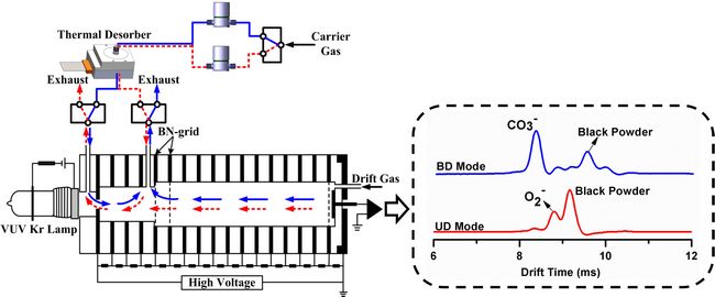 该团队发现不同反应试剂离子和爆炸物反应会形成不同的产物离子和特征谱图。通过简单的气流切换实现了非放射性掺杂剂辅助负离子光电离源中两种反应试剂离子CO3-和 O2-的快速切换,切换时间小于2s。将这种电离源和离子迁移技术相结合,用于典型爆炸物三硝基甲苯、黑索金、硝铵和黑火药的检测,实验结果表明:两种反应试剂离子的快速切换能够为爆炸物的准确鉴定提供更多信息,有利于降低误报率,增强鉴定准确性;另外,也可以改善和产物离子的峰-峰分离度、增强检测灵敏度和扩展可检测爆炸物的范围。