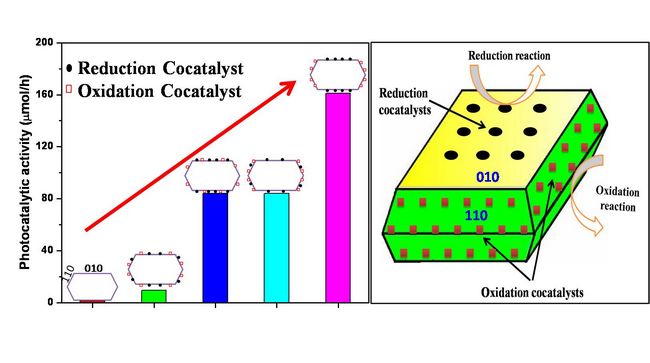 近日,中科院大连化学物理研究所李灿院士领导的太阳能研究部继发现BiVO4等半导体的不同晶面间电荷分离效应后 (Nature Commun., 4, 1432, 2013,Rengui Li, Fuxiang Zhang, Hongxian Han and Can Li et al),相关研究工作又取得新的进展。利用半导体光催化剂的不同晶面之间电荷分离效应,设计组装氧化还原双助催化剂于光催化剂的不同暴露晶面上,可将光催化剂活性提高两个数量级以上,进一步确认了晶面间光生电荷分离的效应和双助催化剂的协同促进作用,为理性设计合成高效光催化剂提供了策略。相关结果近期发表在能源与环境科学领域期刊Energy & Environmental Science上(Energy Environ. Sci., 2014, DOI:C3EE43304H, Rengui Li, Hongxian Han, Fuxiang Zhang , Donge Wang and Can Li)。