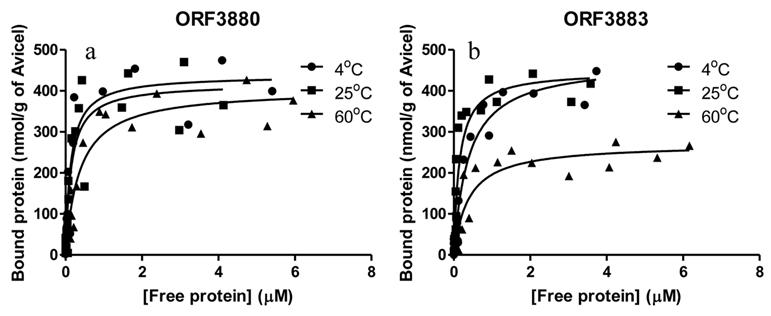 图2. ORF3880和 ORF3883 在4C, 25Cand 60C下与微晶纤维素的等温吸附线
