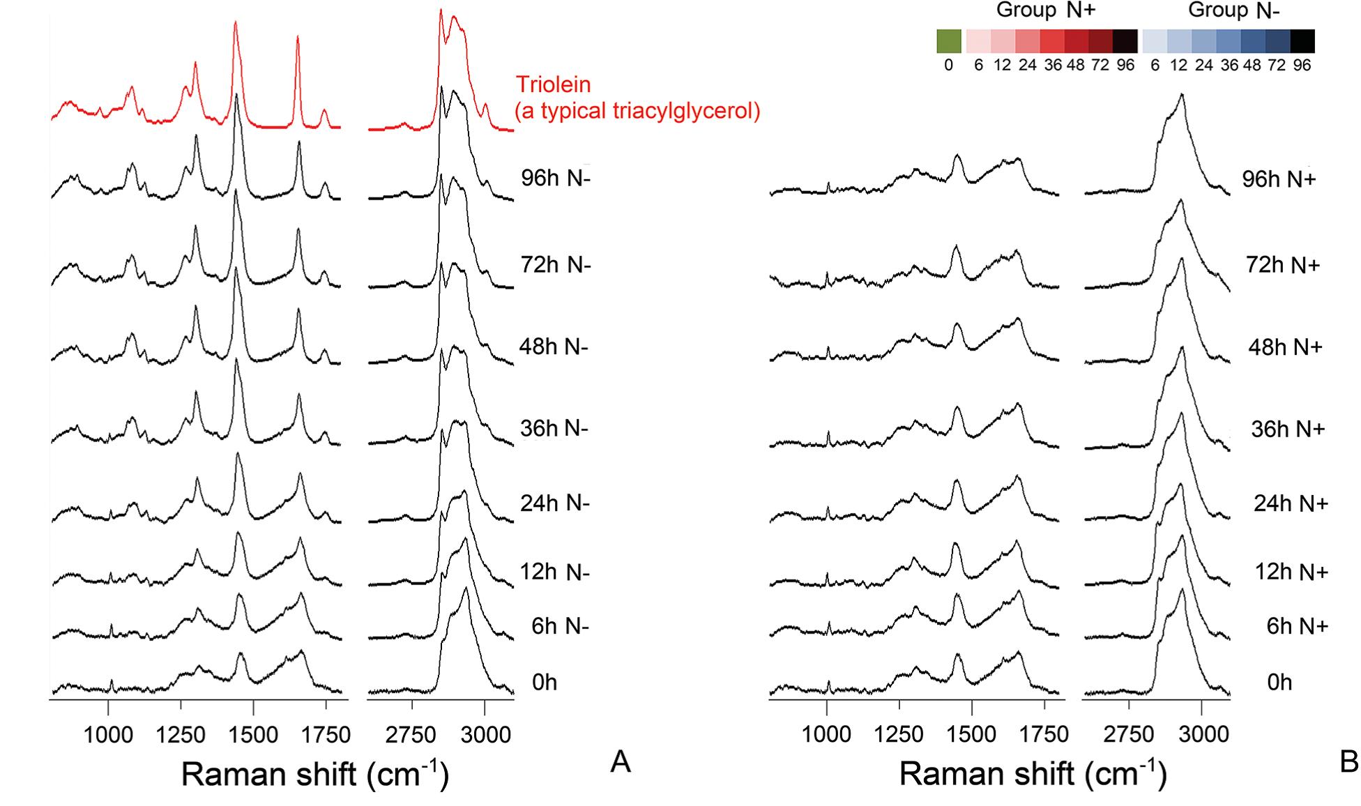 图1、利用单细胞拉曼光谱技术在单个细胞精度实时监测微藻产油过程。微拟球藻细胞在缺氮(A)和对照条件下(B)不同时间点的拉曼图谱,以TAG的典型种类triolein图谱作为参照。图中每条图谱是60个单细胞光谱的平均值。