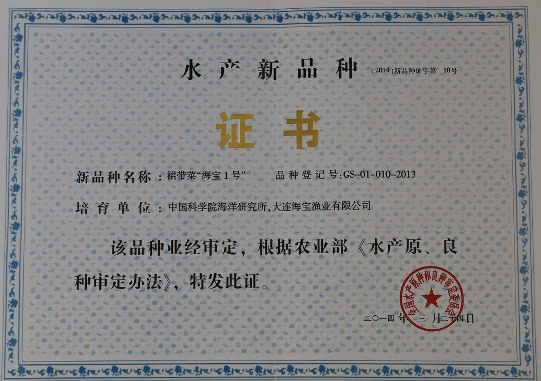 裙带菜“海宝1号”是我国培育的第一个裙带菜新品种,填补了我国裙带菜良种培育的空白,对实现海水养殖良种化,推动裙带菜栽培产业的持续、稳定、健康发展将起到重要促进作用。