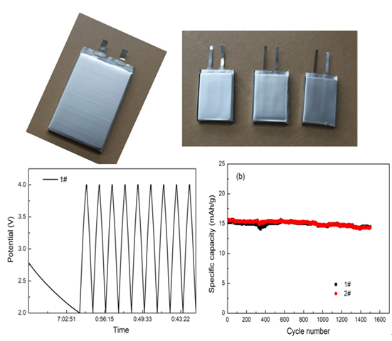 图1 研制出的锂离子电容器器件及其充放电和循环寿命曲线