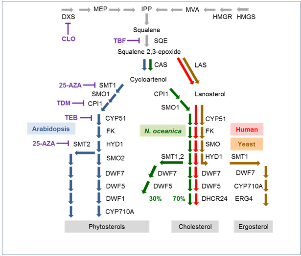 图1. 微拟球藻甾醇合成途径,及其与哺乳动物、高等植物和酵母的联系和区别