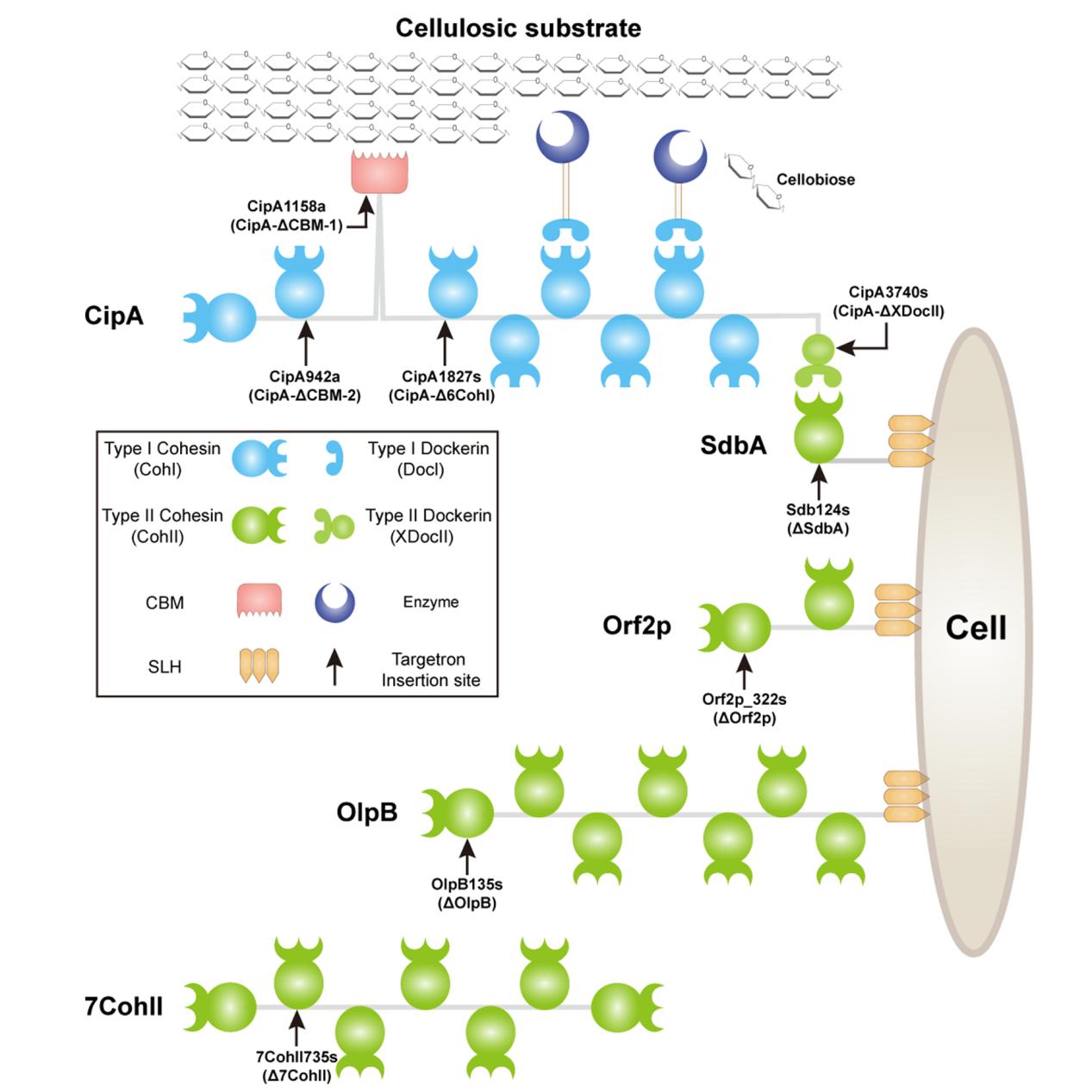 由于纤维小体的复杂性和热纤梭菌遗传操作手段的缺乏,纤维小体中不同水平的相互作用及协同效应在纤维素降解过程中的贡献仍不清楚。研究人员利用前期开发的thermotargetron遗传操作技术(Mohr G, Hong W, et al, PloS One 8(7):e69032),构建了一系列脚架关键模块缺失的热纤梭菌突变株(图1),通过测定和分析突变株的纤维素降解速率、纤维小体形态以及纤维素底物结合率的变化,定量分析了不同脚架蛋白及其模块对纤维小体的纤维素降解活性的贡献。