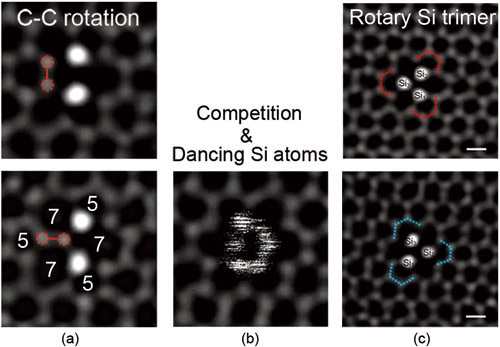 最近,金属所沈阳材料科学国家(联合)实验室固体原子像研究部杨志卿副研究员、先进炭材料研究部尹利长副研究员等与美国橡树岭国家实验室研究人员合作,首先利用像差校正Z衬度电子显微学成像观察到了石墨烯拓扑缺陷结构的动态演变、以及单个Si原子与拓扑缺陷的动态交互并最终掺杂到石墨烯的微观过程,然后采用第一性原理计算揭示了这一原子结构演化的微观机理。直接观察并理解单个原子及其与周围介质材料动态交互行为有助于人们认识物质结构的微观演变并预测新结构的形成,对于纳米科学技术的发展具有重要意义。