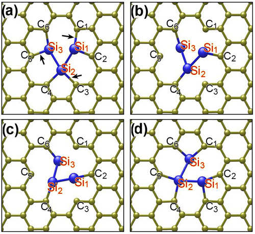 图1 (a)C-C键90 旋转;(b)Si原子竞争占位;(c)Si原子团簇60 旋转