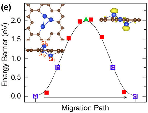 图2 第一性原理计算模拟:(a-d)Si原子团簇旋转过程;(e)能量、过渡态构型的俯视和侧视图(左上角插图)、Pz电子分布(右上角插图)