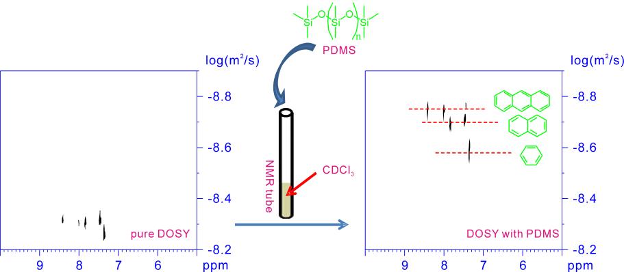 图1:氘代氯仿溶液(0.6 mL)中苯(5 mg)、萘(5 mg)和蒽(5 mg)的1H DOSY(600 MHz)谱图。左图为溶液中没有添加PDMS的DOSY谱图;右图为溶液中添加PDMS的DOSY谱图。实验温度:298K。
