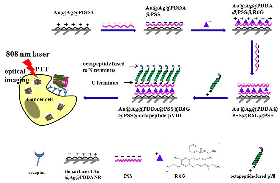 近日,中国科学院青岛生物能源与过程研究所生物传感技术团队博士生王菲等通过模拟噬菌体的组装机理,利用层层自组装技术构筑了多功能仿病毒纳米复合材料,实现了对结肠肿瘤细胞SW620的靶向荧光检测和光热杀伤。该成果在线发表于Scientific Reports (F. Wang, et al., Scientific Reports 2014, 4, 6080)。