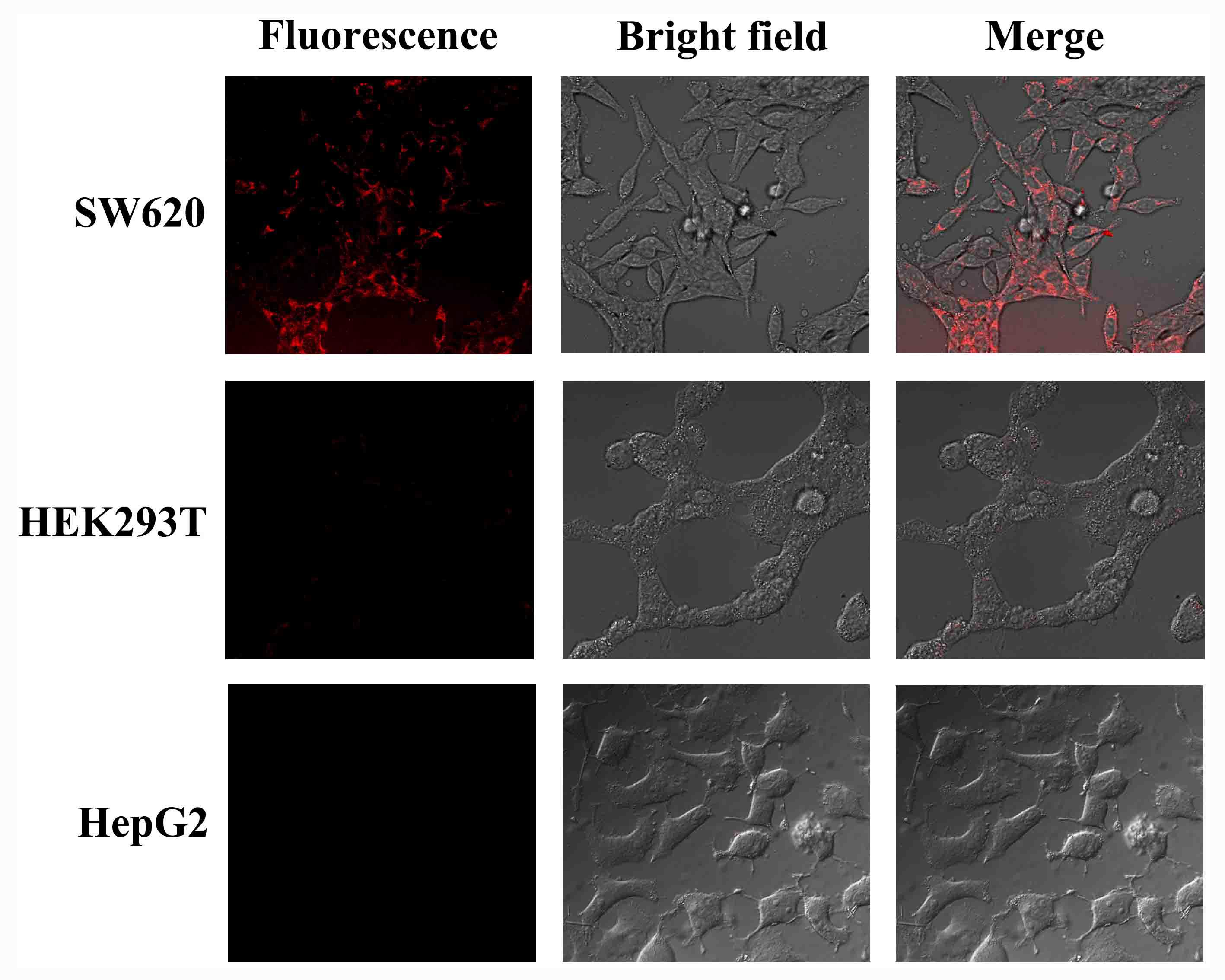图2、 靶标细胞SW620和对照细胞(HEK29T和HepG2)与制备的仿病毒纳米复合材料孵育后的激光共聚焦图像