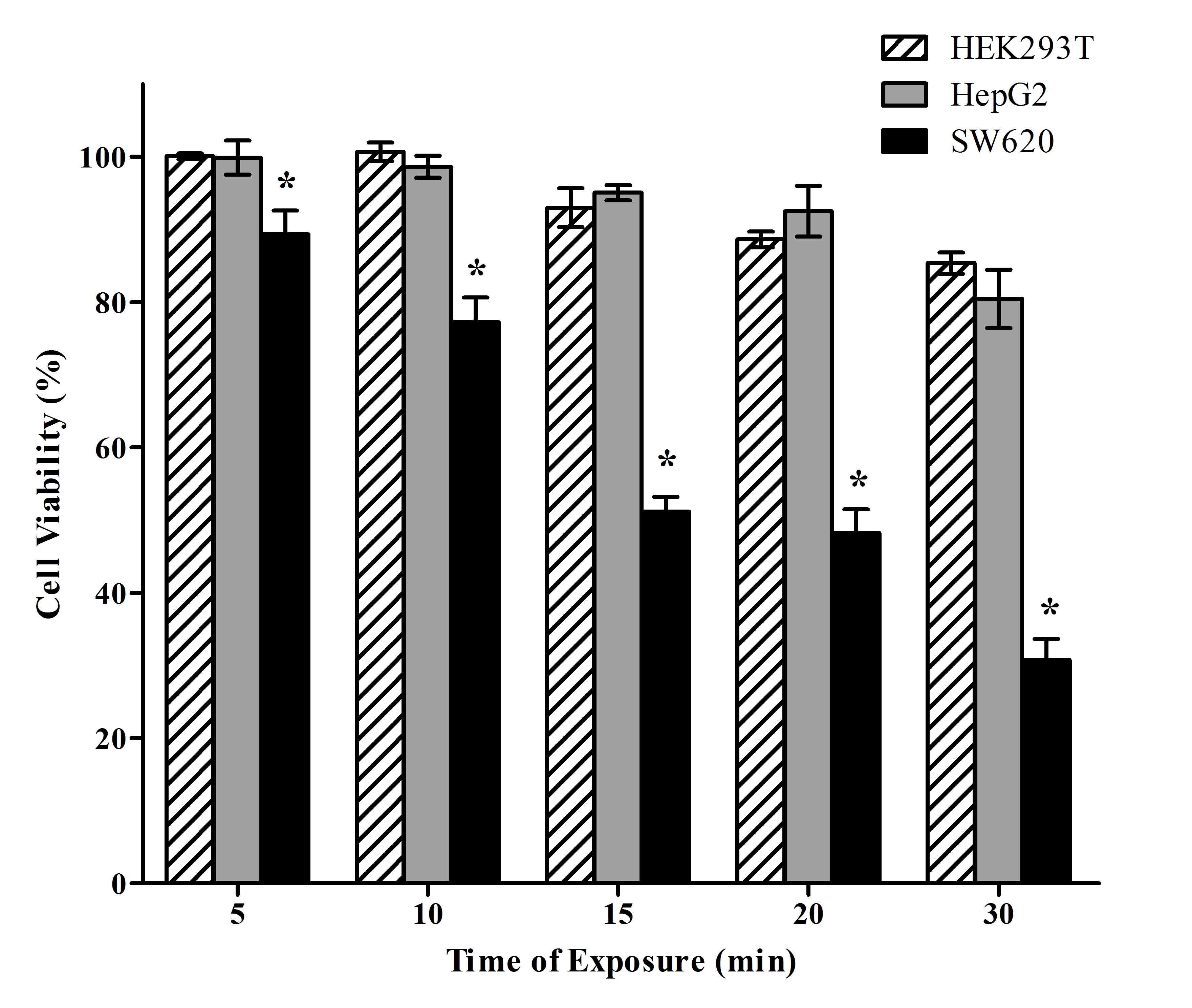 图3、靶标细胞和对照细胞分别与仿病毒纳米复合材料孵育,经808 nm激光照射不同时间后的存活率