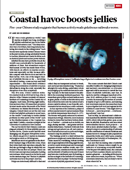10月30日,英国《自然》杂志刊登了题为《Coastal havoc boosts jellies》的文章,对中国科学院海洋研究所孙松研究员科研团队水母研究最新进展进行了报道。