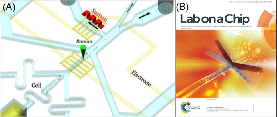 图1. (A)基于阵列介电单细胞捕获/释放单细胞拉曼分选示意图 (B)基于电磁阀吸吮的微流控细胞分离技术(Cover Article)。