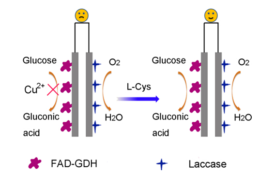生物燃料电池利用酶或产电微生物为生物催化剂,通过电化学途径把生物质燃料中的化学能直接转化为电能,从而提供清洁的能源。此前,生物传感技术团队已经开发出一系列基于微生物表面展示酶的高性能生物燃料电池(L. Xia, et al., Biosensors & Bioelectronics 2013, 44, 160–163; Q. Lang, et al., Biosensors & Bioelectronics 2014, 51, 158–163; C. Hou, et al., Analytical Chemistry 2014, 86, 6057–6063.)。近日,该团队博士后侯传涛等人分别以黄素腺嘌呤二核苷酸型葡萄糖脱氢酶(FAD-GDH)和漆酶(laccase)制备生物阳极和生物阴极,构筑了高性能的葡萄糖/氧气生物燃料电池,最大输出功率密度98 W cm-2,开路电位高达0.78 V。进一步研究发现,Cu2+可以明显抑制该燃料电池的开路电位,而L-半胱氨酸(L-Cys)通过与Cu2+作用形成Cu-S键,能够除去电极表面的Cu2+,从而有效地恢复燃料电池的开路电位。利用该原理设计开发了自供电的L-半胱氨酸传感器(图1)。