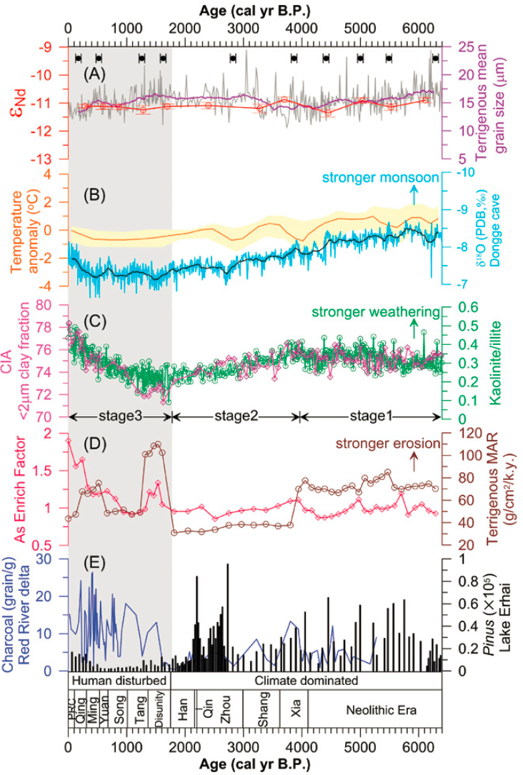 图:过去6400年以来红河流域风化侵蚀与陆地记录对比