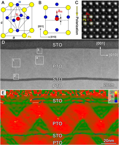 图1、SrTiO3(10nm)/PbTiO3(36nm)/SrTiO3(3nm)/PbTiO3(28nm)/GdScO3多层膜中PbTiO3铁电层的周期性畴结构。(A)PbTiO3晶体结构示意图;(B)[100] 方向的结构投影图;(C)[100]方向摄取的高角环形暗场像(HAADF)展示离子位移的方向和大小;(D)多层结构的低倍高角环形暗场像;(E)基于显微图像的几何相位分析,c畴的空间分布成正弦曲线特征