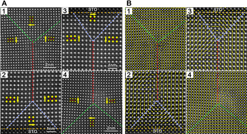 图2、高分辨率原子序数Z衬度像。所有单胞中的离子位移矢量组合在一起构成具有顺时针和逆时针特征的两种通量全闭合结构。这两种闭合结构在薄膜中交替排列构成大尺度的周期性阵列。(A)原始图像;(B)极化矢量与原始图像的叠加清晰展示全闭合回路的构成