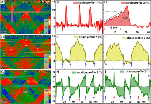 图3、PbTiO3铁电体中周期性相错对的应变分析。推导出整个闭合结构中巨大的长程弹性应变梯度(106/m)