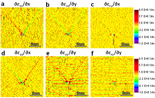 图4、PbTiO3铁电体中通量全闭合畴结构核心处应变梯度分布分析,计算出核心处超大的应变梯度(109/m)