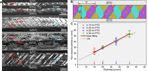 金属所沈阳材料科学国家(联合)实验室的固体原子像界面结构研究团队长期致力于材料基础科学问题的电子显微学研究,经过多年的学术积累并与国内外相关科学家合作,在解决上述重大科学难题方面取得突破。他们通过逆向思维设计,实施应变调控在钪酸盐衬底上制备出一系列超薄的PbTiO3铁电薄膜;利用具有原子尺度分辨能力的像差校正电子显微术,不仅发现通量全闭合畴结构及其新奇的原子构型图谱,而且观察到由顺时针和逆时针闭合结构交替排列所构成的大尺度周期性阵列。在此基础上,他们揭示了周期性闭合结构的形成规律,发现在一定的薄膜厚度范围内由通量闭合结构构成的周期性阵列的周期大小与薄膜厚度之间成比值约为
