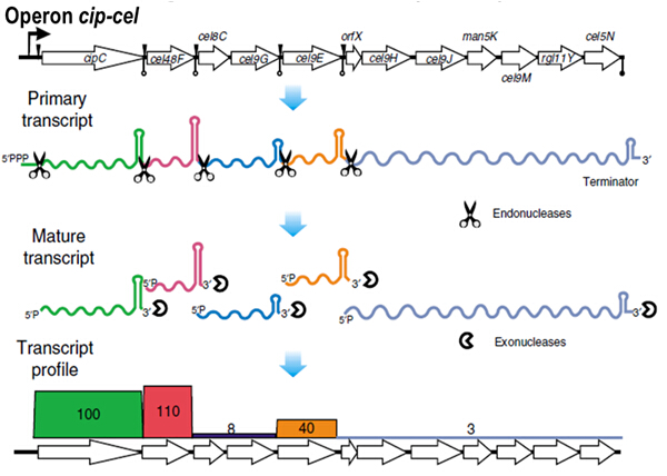 许成钢等证明,包含12个基因的纤维小体基因簇cip-cel属于同一个转录单位,即同一个操纵子。但是,它们在转录本层面的丰度比例却是奇怪的100:110:9:8:38:5:4:2:3:2:3:5, 而且与蛋白质层面的丰度比例成正相关。深入研究发现,这些基因的间隔区分布有至少五个核糖核酸内切酶的剪切位点,导致cip-cel操纵子初始转录的多顺反子mRNA被剪切成至少六个RNA片段。而这些RNA片段3’端的颈环结构因其二级结构的不同,造成了这些RNA片段的稳定性差异,从而形成了纤维小体特定的化学计量比例。有趣的是,这些颈环结构在相关细菌的纤维小体基因簇中既相对保守,又有物种特异性。因此,研究人员提出,在活体细胞中,纤维小体化学计量比例是由基因间DNA序列通过颈环结构的折叠能量精确编码的,并通过核糖核酸酶对RNA上这些位点的特异性识别、剪切和选择性保护,实现了对纤维小体“配方”的精确控制,进而驱动着物种纤维素降解能力的进化。
