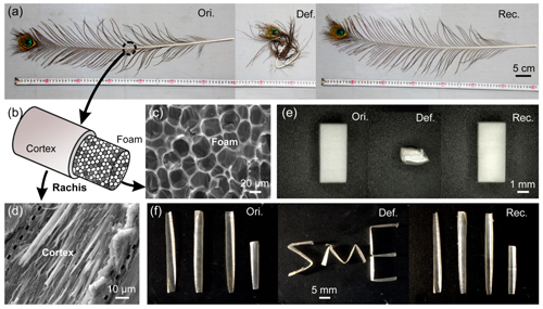 图2:孔雀羽毛及其组成部分在水合作用下的形状记忆效应
