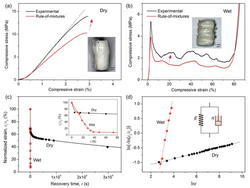 图3:孔雀尾部覆羽羽轴在干、湿状态下的压缩应力-应变曲线以及形状回复的动力学过程