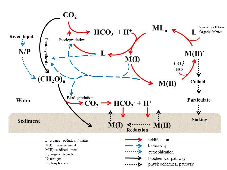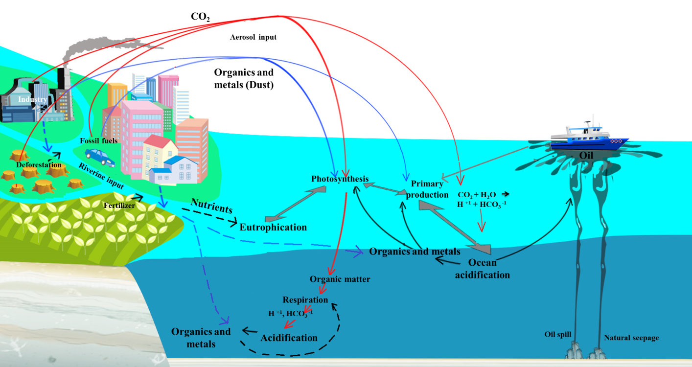 海洋酸化和污染相互作用示意图(上)和机制图(下)