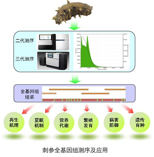 该成果由中国科学院海洋研究所杨红生研究员团队和相建海研究员团队共同完成,在天津生物芯片技术公司的技术支撑下,突破了刺参复杂基因组测序和组装技术瓶颈,采用新一代测序技术获得132Gb高质量DNA序列数据,覆盖全基因组160倍。科研人员利用针对高复杂度基因组组装的创新策略,在国际上首次成功完成了野生刺参的基因组组装,目前获得的框架图总长度达到765Mb,组装叠连群Contig N50达112Kb,该数值优于国际迄今已发表的多数水产动物基因组图谱的指标。初步检测表明,功能基因区覆盖达95%以上。该项研究得到了国家科技部973 、863计划,国家基金委,中国科学院和山东省、青岛市科技厅的资助。