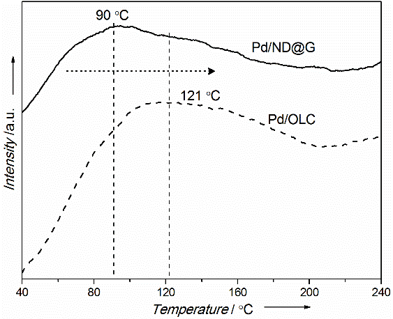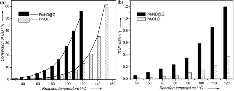 图1. Pd/ND@G和Pd/OLC在CO氧化反应中的催化性能:(a)CO转化率随温度的变化,(b)不同温度下的TOF值