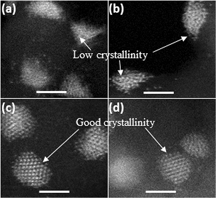 图2. 高分辨的HADDF-STEM电镜照片:(a, b)Pd/ND@G,(c, d)Pd/OLC,Scale bars: 2 nm