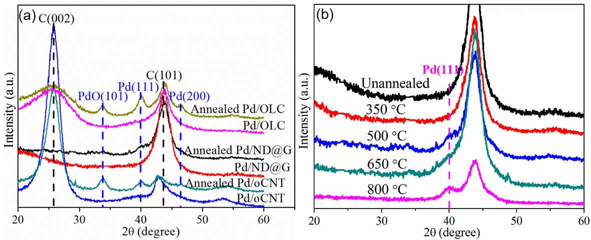 图3. (a)不同催化剂在500 下焙烧前后的XRD谱图,(b)Pd/ND@G在不同温度下焙烧6小时后的XRD谱图