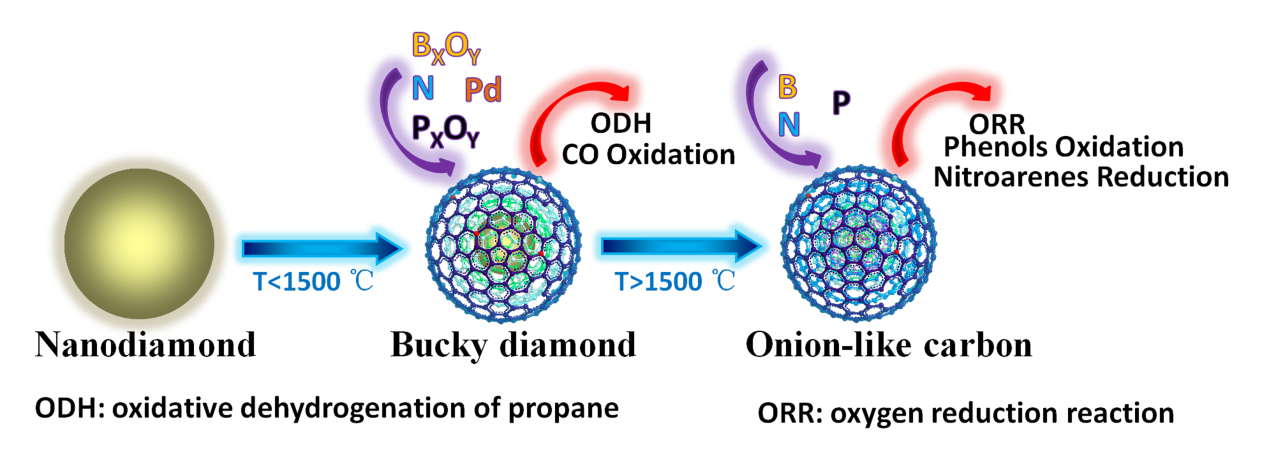 在传统工业催化领域中,金属基催化材料占据着主导的地位,但是其不可再生性以及对环境的污染性是金属材料潜在的弱点。如何开发出具有可替代性的绿色能源催化剂是近些年来研究的热点与重点。纳米金刚石是一类sp3杂化的非金属碳材料,通过简单控制煅烧温度(900~1500 ),可得到的巴基型纳米金刚石(sp2/sp3 杂化)和洋葱碳(sp2)两种延伸性碳材料。纳米金刚石表面含有一定量的sp2 杂化碳,这一独特的sp2/sp3结构使得纳米金刚石及其衍生物有着比传统碳材料更独特的物理化学性质。
