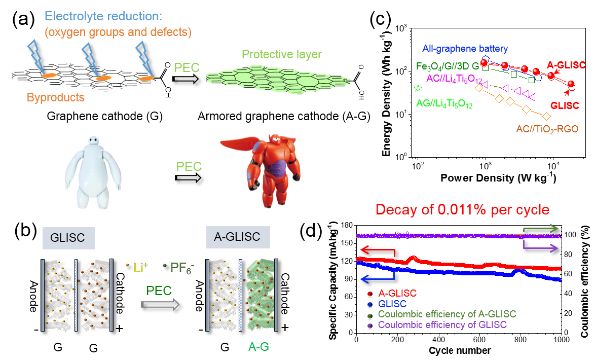 图2 (a)电化学预包覆(PEC)方法原理示意图; (b)石墨烯锂离子超级电容器(GLISC)和采用PEC处理石墨烯正极的锂离子超级电容器(A-GLISC)的结构示意图。(c)PEC包覆后的石墨烯锂离子超级电容器的能量密度-功率密度图。(d)PEC包覆后的石墨烯锂离子超级电容器的循环寿命及库伦效率