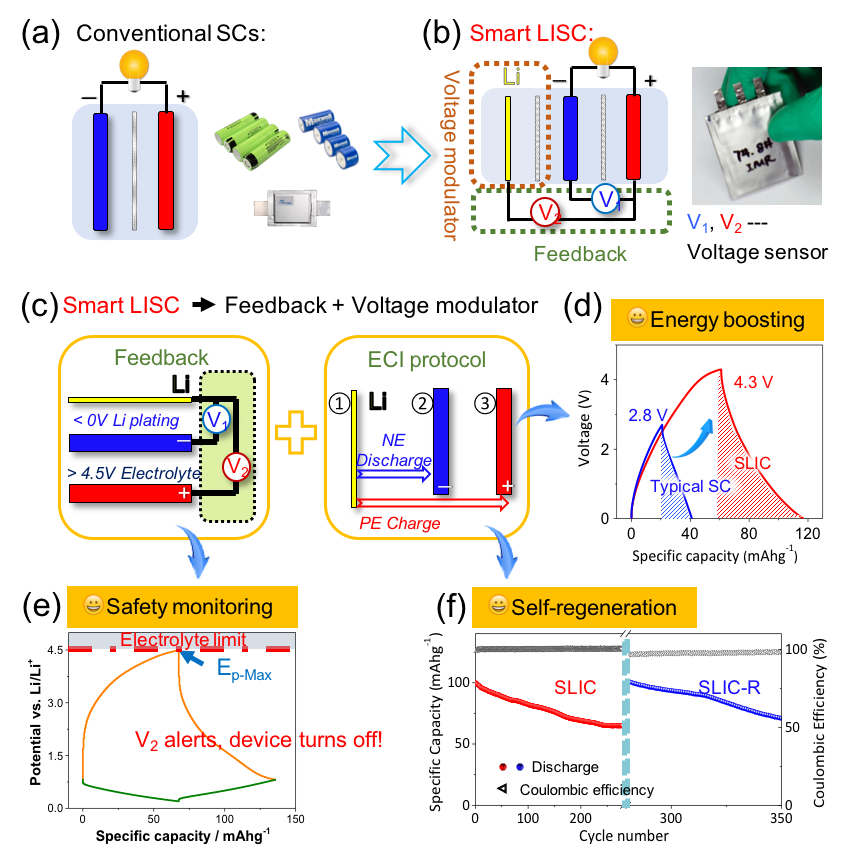 图3 (a)一般超级电容器的结构示意图; (b)智能锂离子超级电容器的结构示意图及实物照片;(c)智能锂离子超级电容器的功能原理示意图;(d, e, f)智能功能: (d)对锂离子超级电容器进行电位优化,以提高能量密度; (e)对锂离子超级电容器进行安全监控; (f)锂离子超级电容器的容量自恢复