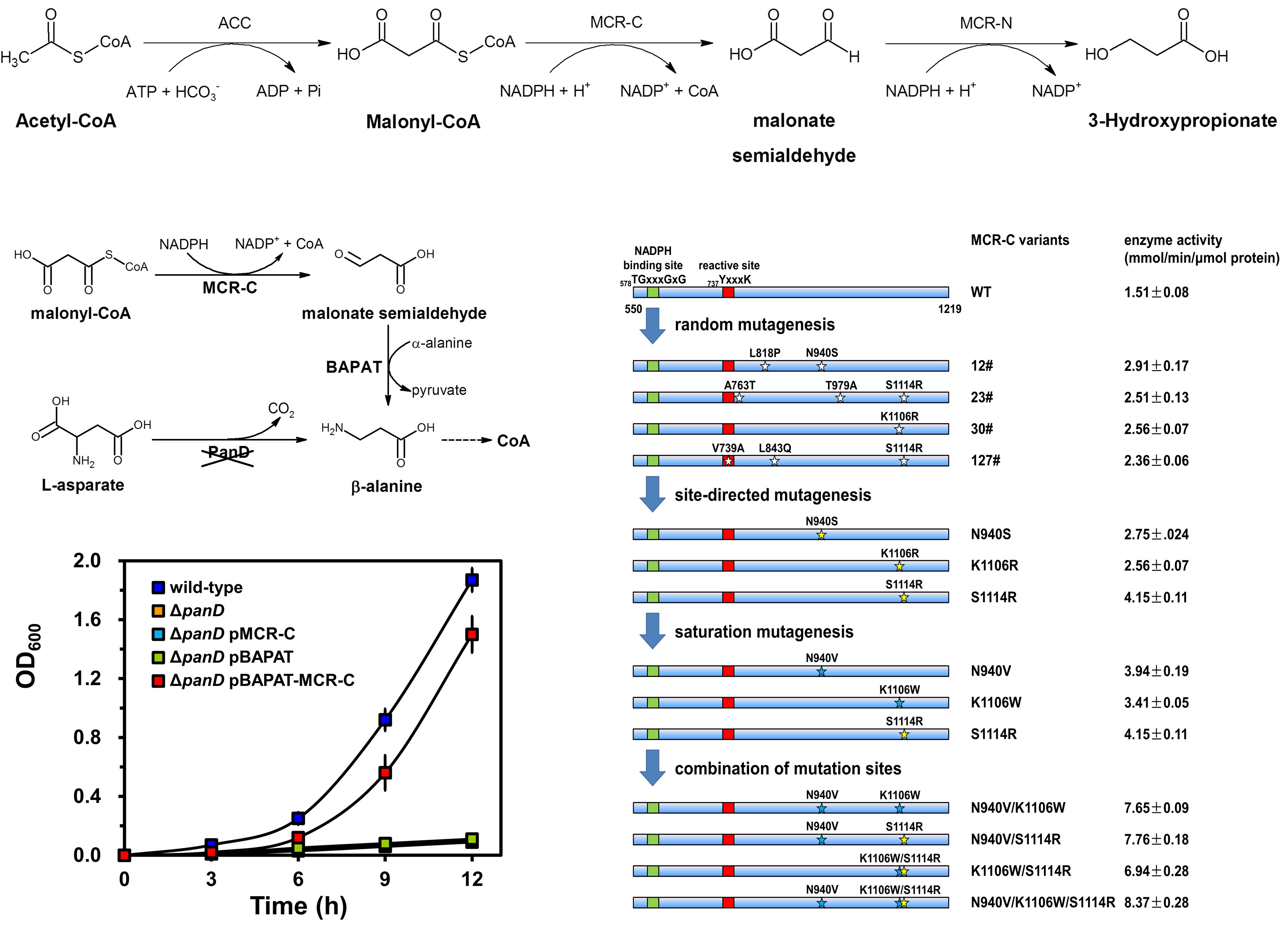 来源于嗜热自养型古细菌Chloroflexus aurantiacus的双功能酶——丙二酸单酰辅酶A还原酶(MCR)是3-羟基丙酸合成新途径中的关键酶,自身具有醛脱氢酶和醇脱氢酶的功能,催化两步反应,将脂肪酸合成的前体物质丙二酸单酰辅酶A 经中间体丙二酸半醛转化为3-羟基丙酸。科研人员通过对该蛋白序列的分析,将MCR蛋白成功拆分为MCR-C和MCR-N两部分,每个部分可独立催化一步反应。更为重要的是,拆分后的蛋白对底物丙二酸单酰辅酶A有着更高的亲和力,酶活力远高于野生型MCR,同时3-羟基丙酸产量也得到了一定提高。以往的代谢工程中,将催化相邻反应的酶构建融合蛋白来提高催化效率是一种常用方法,而我们的研究提出了拆分多功能域蛋白以提高催化能力和产品产量的新思路,对更好的利用功能蛋白尤其是多功能酶类具有普遍的参考价值。