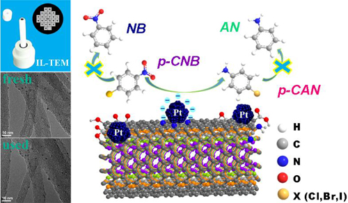 表面改性碳纳米管作为催化剂载体是催化领域的研究热点之一,碳纳米管表面引入的官能团或杂原子可以调控其与负载金属组分间的相互作用,从而影响催化剂对底物的吸脱附,实现催化反应过程的高选择性。对含有各种取代基的芳香硝基化合物选择加氢制备相应的芳胺是精细化工领域最重要的反应之一,这些芳胺类化合物在农药、医药、染料及高分子等领域具有广泛的应用。但当反应物分子中含有C-X (X=Cl、Br、I)、CH=O、-C=O和C≡N等易还原基团时,选择性还原硝基而保留其它官能团对于传统的商业Pt/C催化剂仍面临巨大挑战。