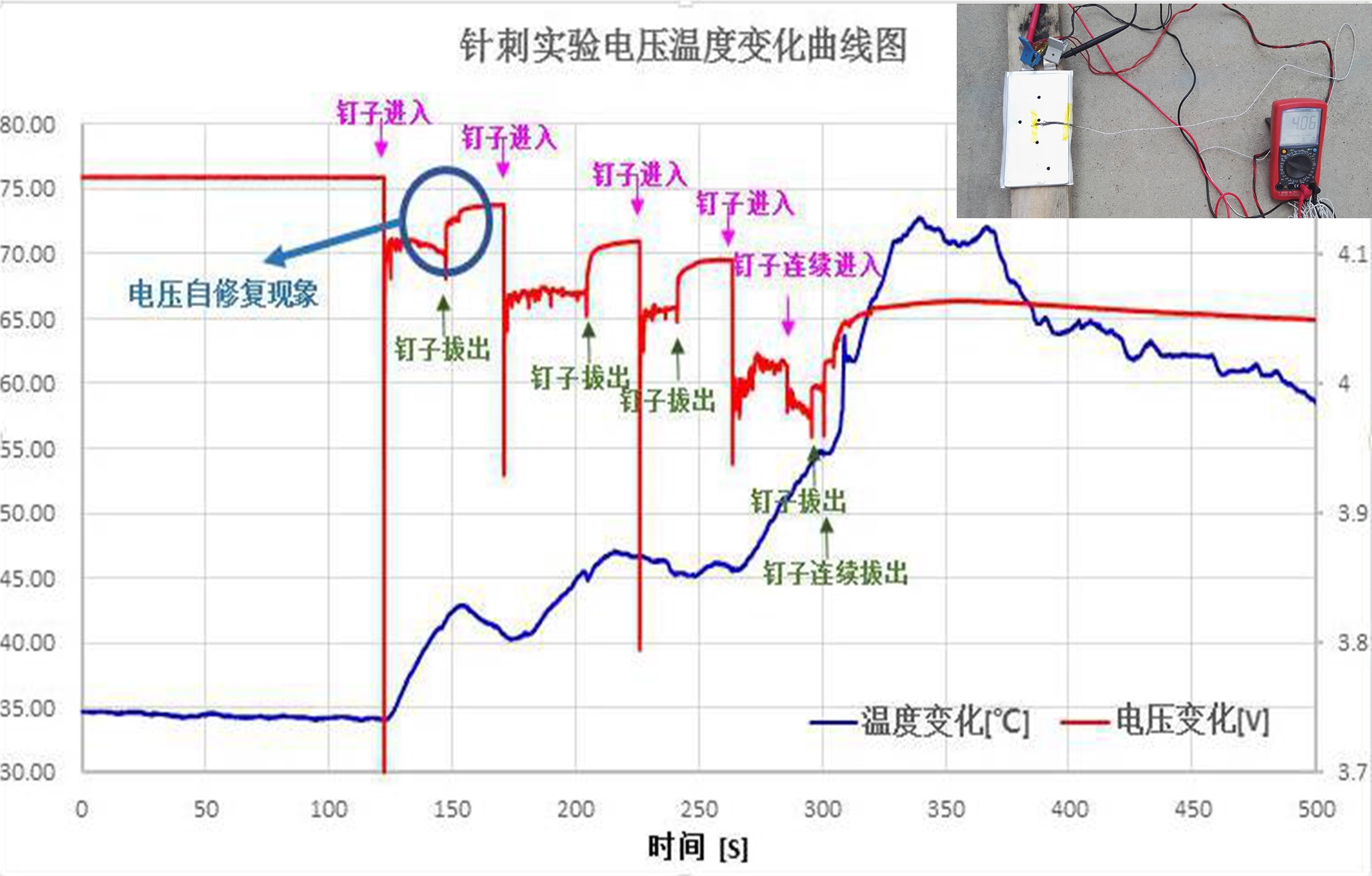 NCM(622)/SPE/Li固态锂电池安全测试--多次针刺电压\温度变化曲线 ( 5次针刺)