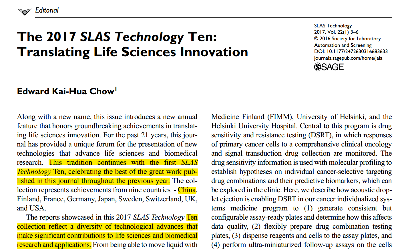 SLAS协会拥有多个SCI收录的学术期刊,每年度都会在众多的论文中评选出十个具有重大创新和突破的研究成果。作为全方位的协会,SLAS服务于广大高校、政府机构、研究所等,为科学技术的快速发展起到了导向和推动作用。