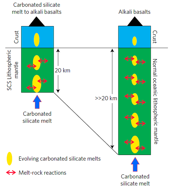 图2. 碳酸盐质岩浆—岩石圈反应简化图。注释:中国南海停止扩张后,深部的碳酸盐化熔体穿透了南海极薄的岩石圈(~20 km),其中一部分转化成了碱性玄武岩;推断碳酸盐化熔体穿过正常厚度的岩石圈后,全部被转化为碱性玄武岩。
