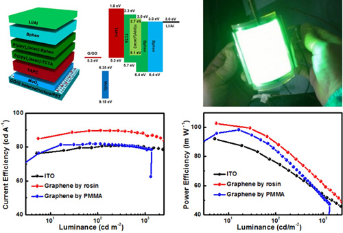 图2 以松香转移的石墨烯薄膜作为透明电极制备的大面积柔性OLED器件