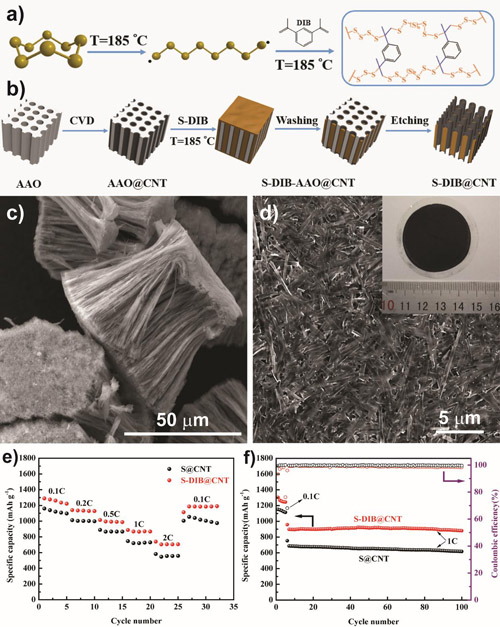 图1. 有机硫聚合物(a) 和有机硫聚合物/碳纳米管复合材料(b)的合成示意图;有机硫聚合物/碳纳米管复合材料(c)和膜电极(d)的扫描电镜照片;物理和化学双重限制的有机硫聚合物/碳纳米管与单一物理限制的硫/碳纳米管复合材料的倍率性能 (e)和循环性能(f)对比