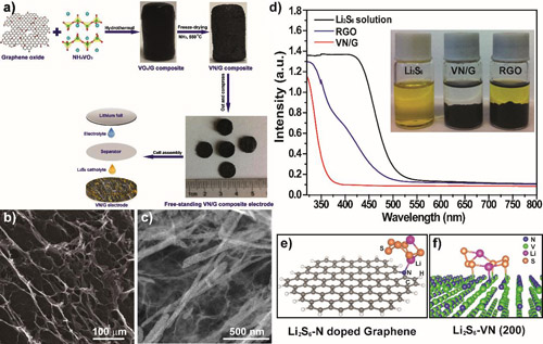 图2 (a)氮化钒/石墨烯复合材料的制备及锂硫电池组装示意图;氮化钒/石墨烯复合材料的扫描电镜照片(b)和扫描透射电镜照片(c);(d)氮化钒/石墨烯复合材料对多硫化物的吸附性能;氮掺杂石墨烯(e)与氮化钒(f)与多硫化物相互作用的理论计算模型