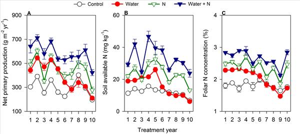中国科学院沈阳应用生态研究所方运霆和姜勇两个团队与中国科学院植物研究所韩兴国团队等合作,通过在中国科学院多伦恢复生态学实验站内蒙古典型草原进行十年的水分和氮素添加控制实验,发现在实验处理前六年,降雨增加显著提高植物生产力、土壤可利用氮和叶片氮含量。但是,在接下来的四年,降雨增加不再提高植物生产力以及土壤和植物氮含量。然而在水氮同时添加的处理中,植物生产力持续增加,土壤可利用氮和叶片氮含量也持续增加(图1)。该研究结果表明在长期的降水增多后,氮供给限制了水分对植物生产力的促进作用,也表明过去的模型高估了降水对草地生态系统生产力和碳吸存的作用。通过对植物和土壤、土壤铵态氮和硝态氮的稳定同位素自然丰度的进一步研究,发现实验后期降雨增加导致氮损失增多,其中反硝化作用很可能是氮损失的重要途径,从而加剧了氮供给对植物生长的限制(图2)。这些结果表明草地生态系统对长期降雨增加的响应格局受土壤氮可利用性的调节,长期降雨增加会导致半干旱地区从水氮共同限制转变为氮独立限制,也表明气候变化将诱导生态系统资源限制类型发生改变。
