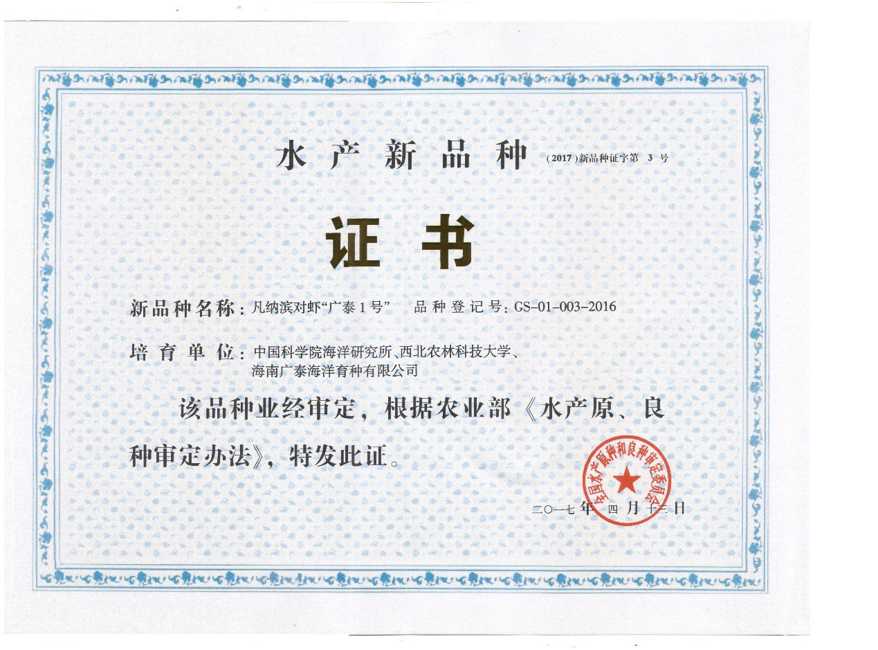 近日,农业部公布了2017年通过审定的14个水产新品种,由中科院海洋研究所与西北农林科技大学、海南广泰海洋育种有限公司合作培育的凡纳滨对虾“广泰1号”榜上有名。这是海洋研究所自凡纳滨对虾“科海1号”后又一通过审定的凡纳滨对虾新品种。