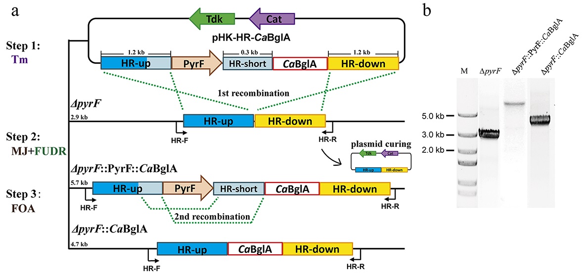 图1. 热纤梭菌重组菌株DSM1313::CaBglA的构建及验证