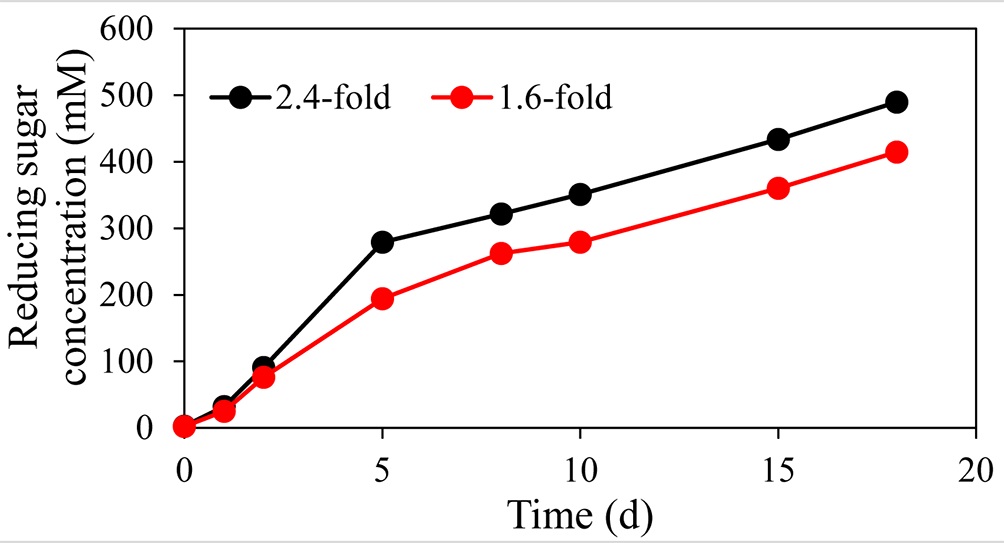 针对这一研究现状,代谢物组学团队对热纤梭菌及其纤维小体进行有针对的定向改造,通过建立无疤基因组编辑系统,将源于极端嗜热菌的 -葡萄糖苷酶CaBglA与关键纤维小体酶Cel48S进行融合表达并组装到胞外纤维小体上(图1)。利用该重组菌株作为全菌催化剂进行糖化反应发现,以100 g/L微晶纤维素为底物时,其还原糖产量达489 mM(以葡萄糖分子量换算为约88 g/L)(图2)。该菌高效降解纤维素及生产可发酵糖的能力初步证明了木质纤维素的全菌催化糖化策略在工业化应用中的可行性。该研究拓展了木质纤维素糖化的新视野,有力推动了工业发酵领域中纤维素糖作为碳源对淀粉糖的替代。(文/图 刘亚君)