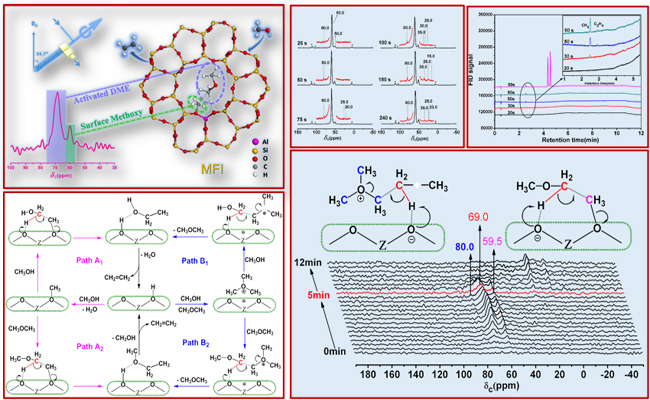 甲醇制烯烃国家工程实验室一直坚持应用研究与基础研究并重,不但在甲醇制烯烃(MTO)过程工业化方面取得巨大成功,而且长期致力于该化学过程中的基础科学问题研究。虽然MTO过程稳态反应阶段的间接机理已形成广泛的共识,但MTO反应中从C1物种甲醇或者二甲醚生成第一个C-C键的反应一直是C1化学中极具挑战性和争议性的课题。由于转化发生在反应的最初始阶段,难以捕获中间物种,一直以来所提出的反应机理缺乏直接证据。本项工作中,研究人员通过在线监测最初始反应阶段,推测初始烯烃来源于催化剂表面C1吸附物种的直接转化;随后通过催化剂液氮淬冷和固体核磁表征,确定了催化剂上最初始反应阶段存在的表面C1吸附物种(甲醇和二甲醚)和C1活性物种(表面甲氧基和三甲基氧鎓离子);进一步通过原位固体核磁研究,在真实甲醇转化反应条件下,成功捕捉到二甲醚C-H键活化后生成的类亚甲氧基(methyleneoxy analogue)物种,由此获取了C1物种活化生成第一个C-C键的直接证据;在此基础上提出了初始烯烃生成的反应路径—表面甲氧基/三甲基氧鎓离子协助甲醇/二甲醚活化转化的协同反应机理。这是首次在MTO反应过程中原位观测到C1物种的初始活化和转化,这一发现将关联甲醇初始转化的直接机理和高效转化阶段的间接机理,建立甲醇转化反应完整的反应历程。此前在MTO反应稳定阶段烃池(Hydrocarbon Pool)机理的研究中,研究人员曾直接捕捉到最为重要的反应中间物种—苯基和环戊烯基碳正离子中间体,并确定了分子筛催化甲醇制烯烃的催化循环途径(J. Am. Chem. Soc.2012,134(2),836—839;Angew. Chem. Int. Ed.2013,52(44),11564-11568)。这些工作丰富了C1催化化学的基本理论,也对MTO的工业应用具有重要的促进和支撑作用。