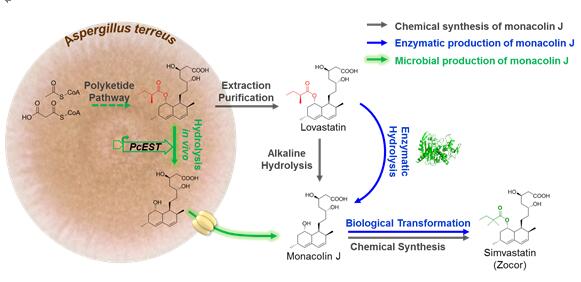 辛伐他汀(Zocor)是土曲霉天然产物洛伐他汀的半合成衍生物,是一种重要的降血脂药,2015年全球销售额达到30亿美元。辛伐他汀的工业生产工艺可分为三个过程:土曲霉发酵生产洛伐他汀,碱水解洛伐他汀制备monacolin J,化学方法将monacolin J转化成辛伐他汀(图1)。针对monacolin J转化成辛伐他汀,美国研究人员前期开发了基于酰基转移酶LovD的生物催化转化方法,并获得2012年美国总统绿色化学奖。但monacolin J的制备仍然是使用传统的碱水解洛伐他汀工艺,工序相对复杂、环境污染较大。因此,开发一种绿色高效的monacolin J生产方法非常重要。包括默克公司在内的研究团队曾试图开发可替代的生物转化方法,但是由于效率较低,都未能应用到实际生产中。近年来,青岛能源所微生物代谢工程团队(mme.qibebt.ac.cn)基于在丝状真菌遗传改造方面的研究基础,与全球最大的洛伐他汀/辛伐他汀原料药生产企业浙江海正药业集团进行了深入合作,旨在对海正药业的洛伐他汀工业生产土曲霉菌株进行代谢工程改造,使之能直接发酵生产monacolin J。