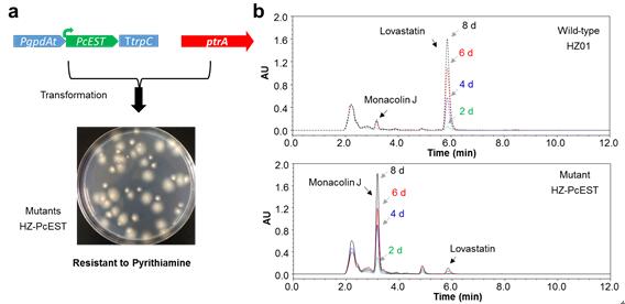 近期,研究团队通过体外实验鉴定了一个能高效水解洛伐他汀生成monacolin J的洛伐他汀水解酶PcEST,其活性远高于专利报道的洛伐他汀水解酶,是后者的232倍,而氨基酸序列一致性仅为16.8%,这说明PcEST是不受现有知识产权限制的高效洛伐他汀水解酶,为研究成果的实际应用提供了知识产权保障。